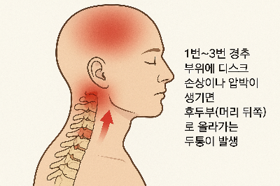 1번~3번 경추 부위에 디스크 손상이나 압바기 생기면 후두부( 머리 뒤쪽)로 올라가는 두통이 발생할 수 있습니다. 이른바 '디스크성 두통'으로 목 통증이 심하지 않아도 상부 디스크 문제로 인해 신경이 교란되어 두통이 나타나는 경우가 있습니다.