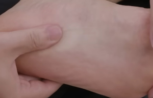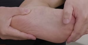② 이 상태에서 족저근막이 뼈에 붙는 부위부터 발가락 쪽으로 따라가면서 지그시 눌러줍니다.