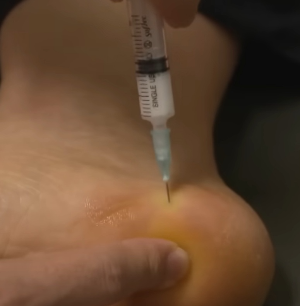 ② 먹는 약으로 증상이 호전되지 않을 경우, 족저근막에 소염 진통제 성분의 약물을 직접 주사하여 통증을 효과적으로 감소시킬 수 있습니다.